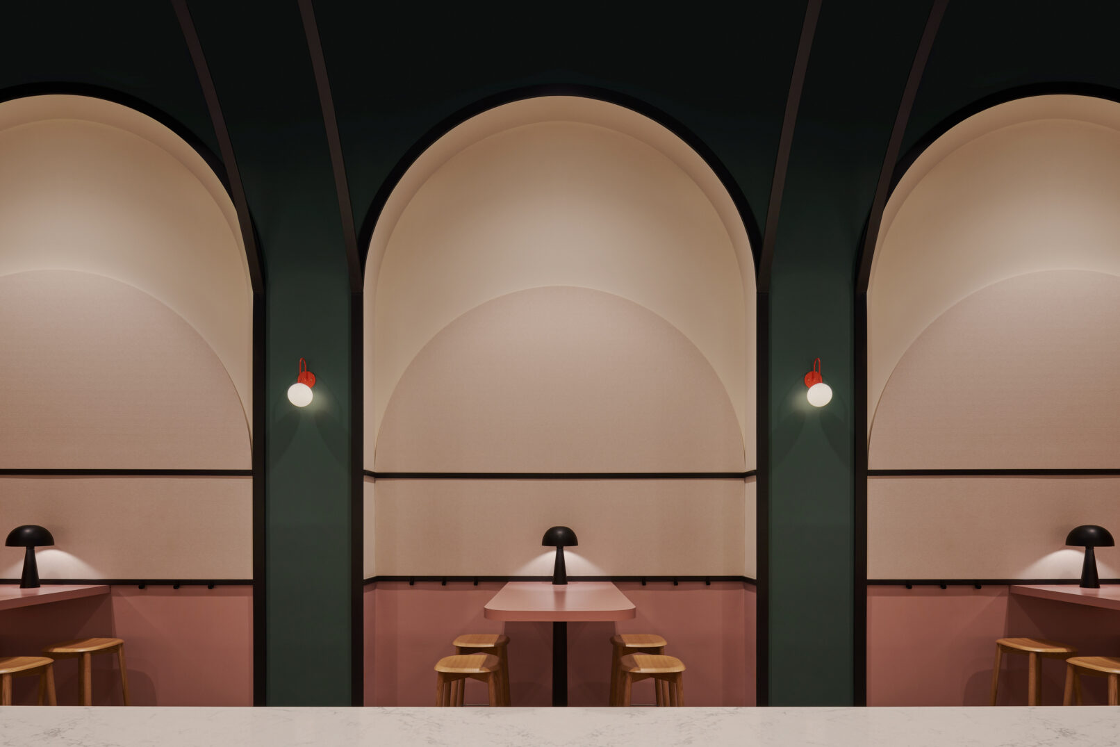 For this dreamy oasis in the heart of Midtown, Habitat Matter integrated acoustic wall panels in the shape of soft cream arches to create a friendly and inviting atmosphere.